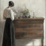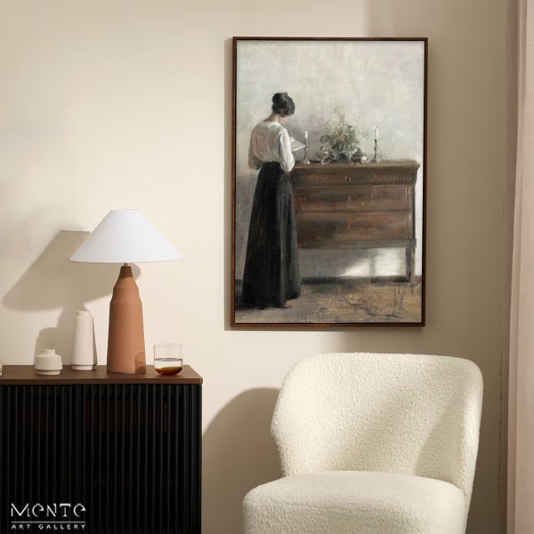This is a charming oil painting that beautifully captures a moment of tranquility. The artwork features a woman in a white blouse and black skirt, standing in front of a wooden sideboard. She is delicately arranging flowers in a vase, adding a touch of elegance and grace to the scene. The sideboard is adorned with a mirror, two candlesticks, and a bowl of fruit, creating a homely and inviting atmosphere. The painting is done in a muted color palette, with a focus on the woman and the sideboard. The background is a plain wall with a hint of a window on the left side, adding depth to the piece. This piece would make an excellent addition to any art collection or as a statement piece in your home or office. Its distinctive design makes it versatile enough to complement a variety of decor styles.