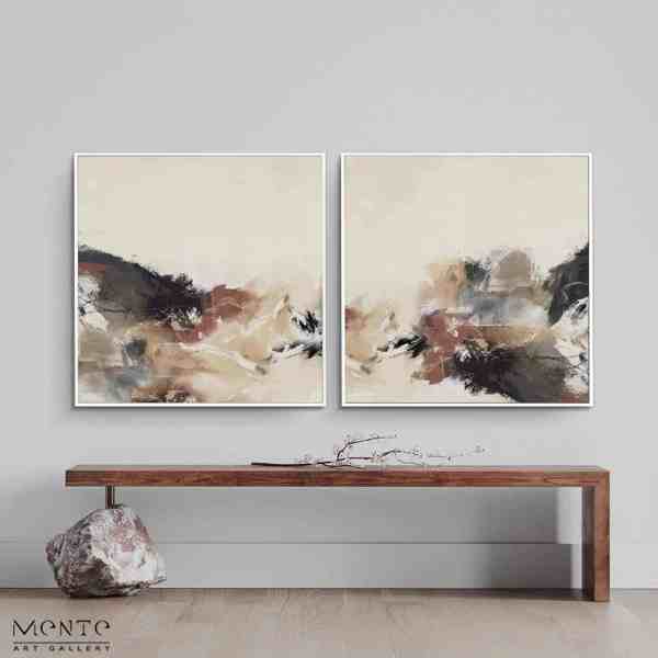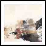 This is a handmade abstract painting that exudes a sense of calm and serenity. The painting features a white background, framed in black, providing a stark canvas for the play of colors. The artwork showcases a mix of colors, including beige, brown, black, and gray. These colors are applied in a loose and fluid manner, creating a sense of movement and depth that draws the viewer in. The painting has a textured appearance, with visible brushstrokes and layering of colors adding to its tactile appeal.
