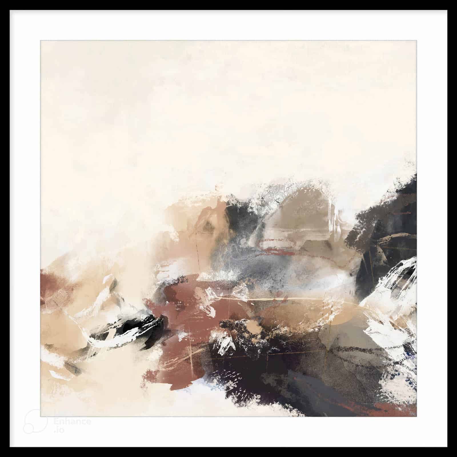This is a handmade abstract painting that exudes a sense of calm and serenity. The painting features a white background, framed in black, providing a stark canvas for the play of colors. The artwork showcases a mix of colors, including beige, brown, black, and gray. These colors are applied in a loose and fluid manner, creating a sense of movement and depth that draws the viewer in. The painting has a textured appearance, with visible brushstrokes and layering of colors adding to its tactile appeal.