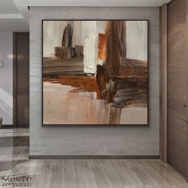 This is a captivating abstract painting that exudes a somber and earthy mood. The painting features thick brushstrokes in various shades of brown, black, and white, creating a textured and layered effect that adds depth and complexity to the piece. The painting is in a square format with a white border, enhancing its modern aesthetic. The earthy tones and the abstract nature of the painting invite viewers to interpret and find their own meaning in it, making it a conversation starter. This handmade painting is not just an art piece – it’s an expression of style and taste. Its abstract nature and unique color palette make it a standout piece that would be a great addition to any art collection.