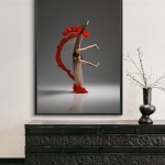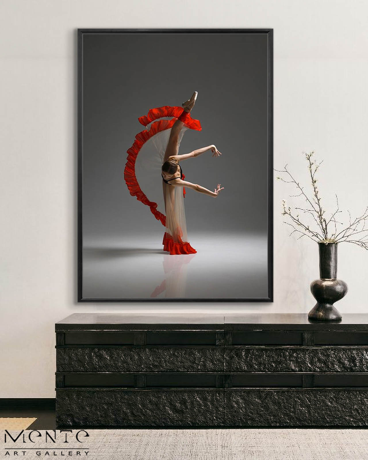 This is a beautiful handmade painting that captures the elegance of a dancer in mid-motion. The dancer is adorned in a flowing dress with vibrant red accents, striking an expressive pose that showcases the beauty and fluidity of dance. This painting would make a stunning addition to any space, adding a touch of artistic flair and sophistication.