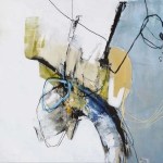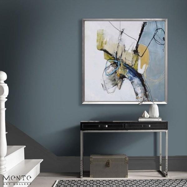 This is a fascinating abstract painting that is sure to captivate any art enthusiast. The painting features a white background adorned with various shapes and colors, including a blue circle, a yellow rectangle, and a gray square. A large black line runs diagonally from the top left to the bottom right, adding a dynamic element to the piece. The painting has a textured appearance, with some areas appearing to be painted over or layered, giving it depth and complexity. This handmade painting is more than just an art piece – it’s an expression of style and taste. Its abstract nature invites viewers to interpret and find their own meaning in it.