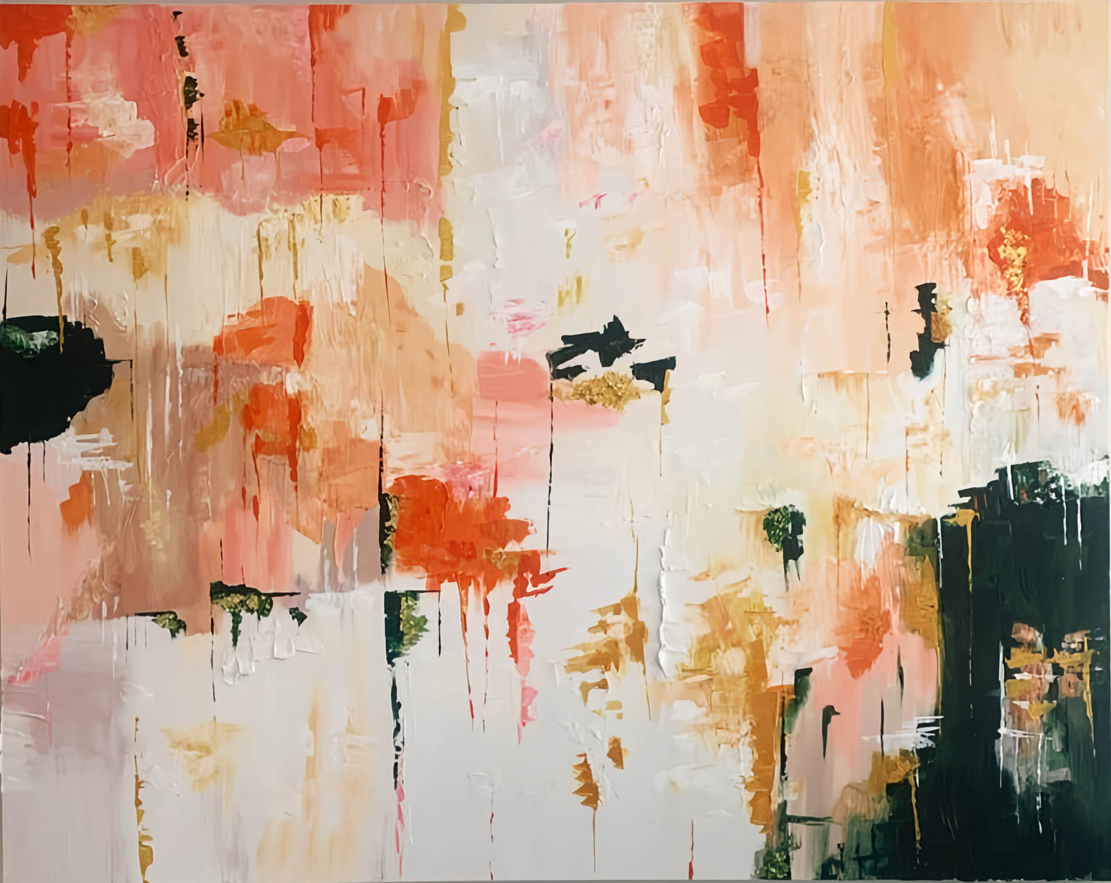 This is an appealing abstract painting that will add some color and creativity to your space. The painting is predominantly orange, pink, and white with black accents, creating a contrast and a balance between warm and cool colors. The painting has a textured appearance with drips and splatters of paint, giving it a spontaneous and artistic quality. The painting has a few black bird-like shapes scattered throughout, which add some interest and mystery to the painting. The painting is on a white background, which makes it easy to match with any wall color. This painting is suitable for anyone who loves abstract art and wants to add some fun and originality to their space.