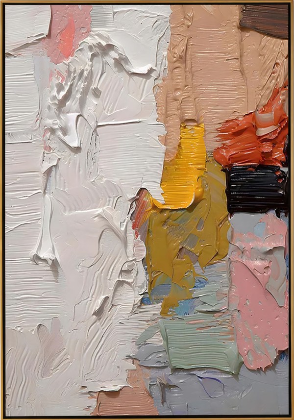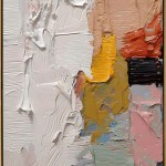 This captivating artwork features thick, textured brushstrokes in an abstract style. The color palette is rich and diverse, including shades of white, beige, yellow, orange, red, black, and various blues and greens. The heavy application of paint creates a tactile, three-dimensional effect on the canvas. Art enthusiasts who appreciate modern abstract pieces will find this painting intriguing. Remember, the artist’s identity remains a mystery, adding an air of intrigue to this expressive creation.