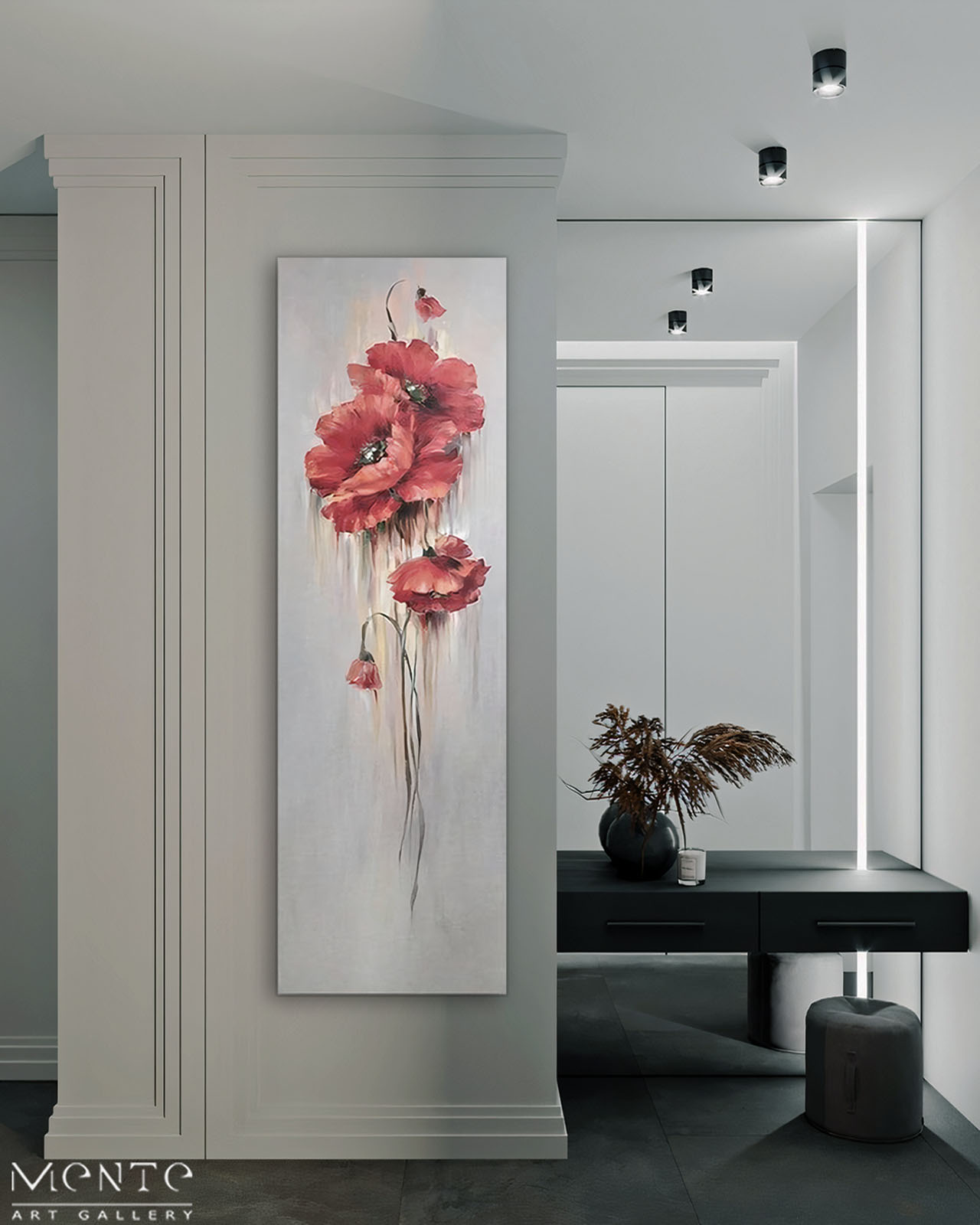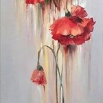 This stunning handmade painting features a cascade of vibrant red poppies set against a soothing gray background. The poppies, painted in a realistic style, draw the eye with their rich color and visible brushstrokes that add texture and depth to the piece. The flowers are arranged in a descending order, with the largest bloom at the top and the smallest at the bottom, creating a sense of movement and dynamism. The background is a light gray color with a gradient effect, darker at the top and lighter at the bottom, which further enhances the visual impact of the red poppies.