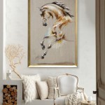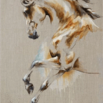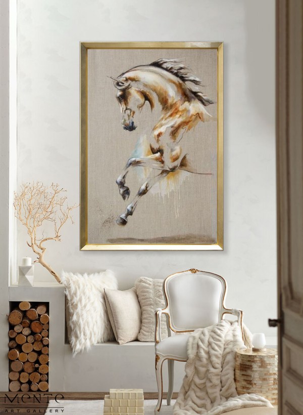 This is a dynamic handmade painting that beautifully captures a horse in motion. The horse, depicted in mid-jump and rearing up on its hind legs, is the focal point of this piece. The painting is done in a loose, impressionistic style with fluid brushstrokes, lending a sense of movement and energy to the artwork. The color palette is muted, featuring tones of beige, brown, and white, which adds to the overall aesthetic appeal. The background is a plain beige color, allowing the focus to remain on the horse. This artwork would make a stunning addition to any art collection or living space. Enjoy this beautiful piece of art!