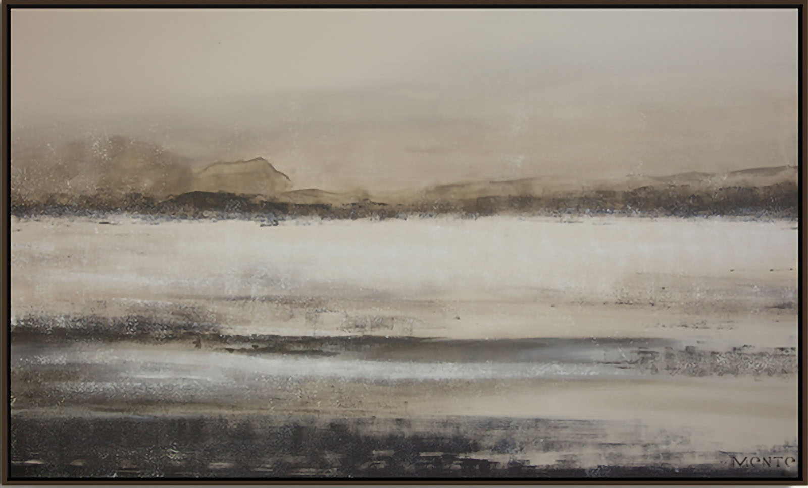 This is a captivating handmade painting that presents an abstract depiction of a landscape. The artwork is monochromatic, utilizing a color palette of browns, whites, and blacks. It portrays mountains in the background and a body of water in the foreground, creating a sense of depth and perspective. The painting’s abstract nature allows viewers to interpret the scene in their own unique way. This piece would make a sophisticated addition to any collection or space.