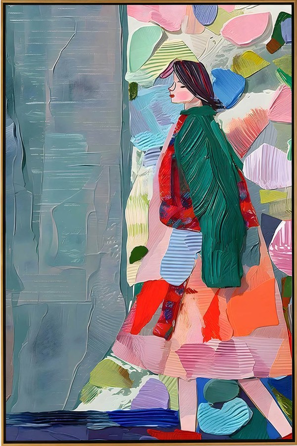 This handmade painting is a vibrant celebration of abstract art, featuring a lively array of shapes and colors that create a dynamic atmosphere. The artwork showcases an woman surrounded by a kaleidoscope of bold hues, including red, green, blue, pink, and yellow. The right side of the canvas is filled with these vivid colors, while the left side presents muted tones, forming what appears to be a door or wall, adding a sense of depth and intrigue. The contrast between the colorful and muted sides, along with the thick, visible brush strokes, emphasizes the handmade nature of the painting. This piece would be a statement addition to any space, perfect for customers looking for a touch of creativity and elegance.