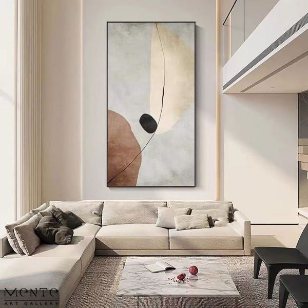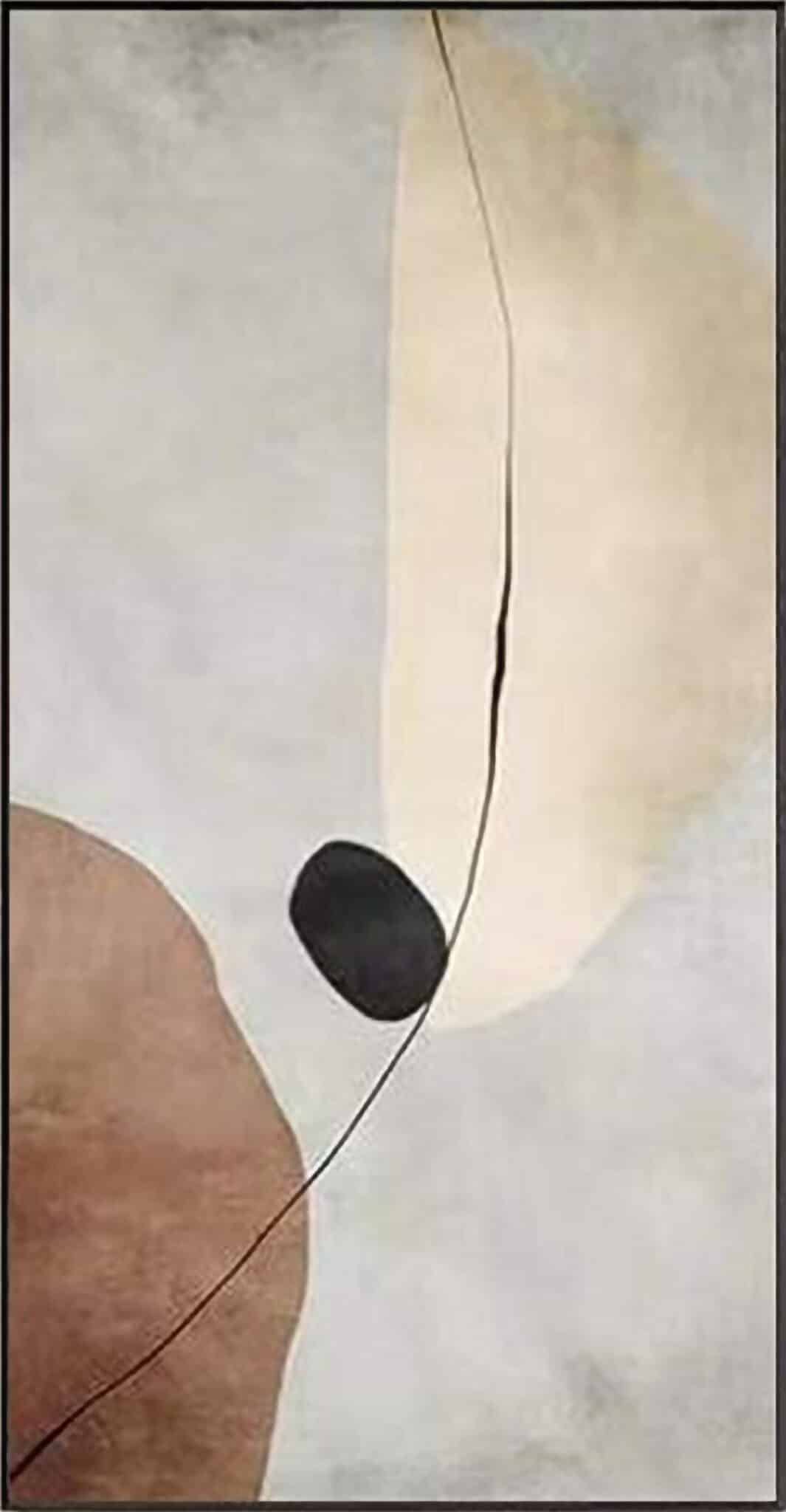 This is an abstract painting that exudes a minimalist and modern aesthetic. The painting is in portrait orientation and composed of a few large shapes in different colors against a light beige background, giving it a soothing and harmonious feel. The largest shape is a light brown semi-circle on the left side of the painting, adding an earthy tone to the piece. The second largest shape is a white semi-circle on the right side of the painting, providing a stark contrast to the brown. The third largest shape is a black circle on the right side of the painting, adding depth and intrigue to the composition. A thin black line runs from the top to the bottom of the painting, further enhancing its modern appeal.