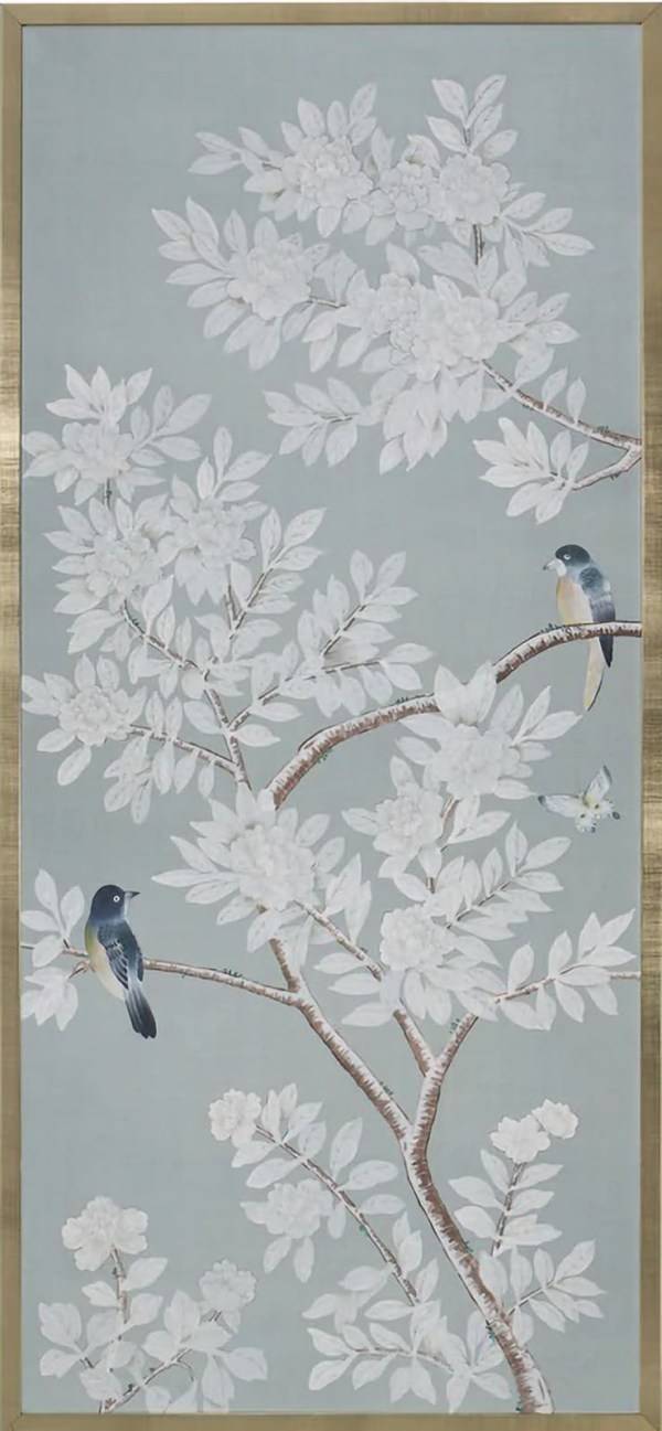 This is a serene and peaceful painting that beautifully captures a floral design with two birds. The artwork features a light blue background adorned with white flowers and branches, creating a calming atmosphere. The flowers, large and multi-petaled, add a touch of elegance to the piece. Adding to the charm of the painting are two birds, blue and white with black accents, perched on the branches. Framed in a gold frame, this painting would make a stunning addition to any home or office space. Its unique design allows viewers to interpret it in their own way, adding a personal touch to their space. This handcrafted painting is not just a decor item, but a conversation starter that adds character to your space.