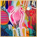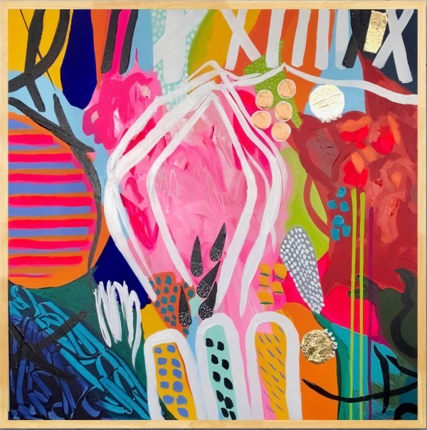 This is a stunning modern painting that will add a splash of color and style to your home. This painting is handmade by a talented artist who uses acrylic paints and gold foil to create a unique and abstract composition. The painting features a large pink shape with black and white stripes that contrasts with the vibrant orange, yellow, and blue background. The painting also has smaller shapes in green, red, and blue that add interest and balance to the design. The painting has a variety of textures, including smooth, rough, and dotted, that create a dynamic and expressive effect. The painting is square in shape and has a white border that frames the artwork. The painting has a small gold foil detail in the bottom right corner that adds a touch of elegance and sophistication. This painting is a one-of-a-kind piece that will make a great addition to your living room, bedroom, or office.