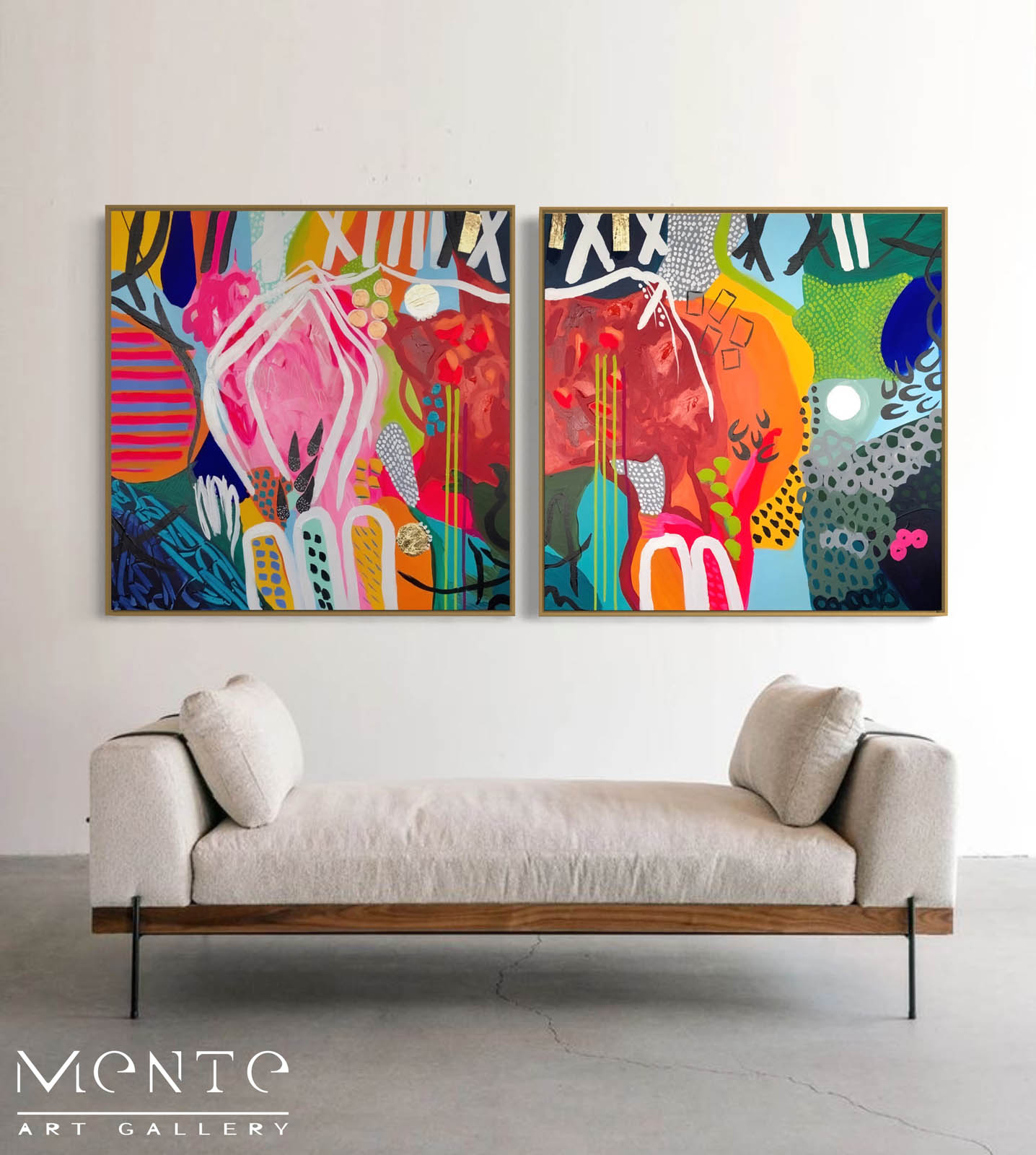 This is a stunning modern painting that will add a splash of color and style to your home. This painting is handmade by a talented artist who uses acrylic paints and gold foil to create a unique and abstract composition. The painting features a large pink shape with black and white stripes that contrasts with the vibrant orange, yellow, and blue background. The painting also has smaller shapes in green, red, and blue that add interest and balance to the design. The painting has a variety of textures, including smooth, rough, and dotted, that create a dynamic and expressive effect. The painting is square in shape and has a white border that frames the artwork. The painting has a small gold foil detail in the bottom right corner that adds a touch of elegance and sophistication. This painting is a one-of-a-kind piece that will make a great addition to your living room, bedroom, or office.