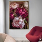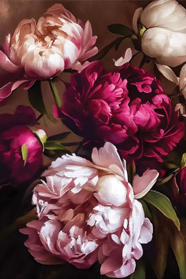The painting features a collection of peonies in various stages of bloom. Rich tones of pink, white, and red dominate the artwork, creating a vibrant yet elegant aesthetic. The flowers are set against a dark background which accentuates their colors and creates depth. Brush strokes are visible, adding texture and emphasizing the handmade quality. The composition is focused on the flowers themselves; there are no additional elements or distractions. This painting would make a wonderful addition to any home or office, bringing a touch of nature’s beauty indoors.