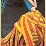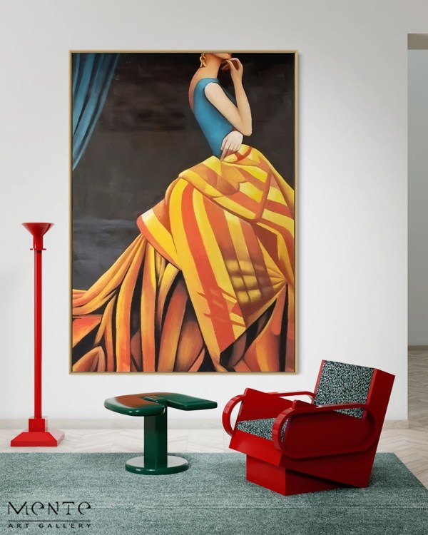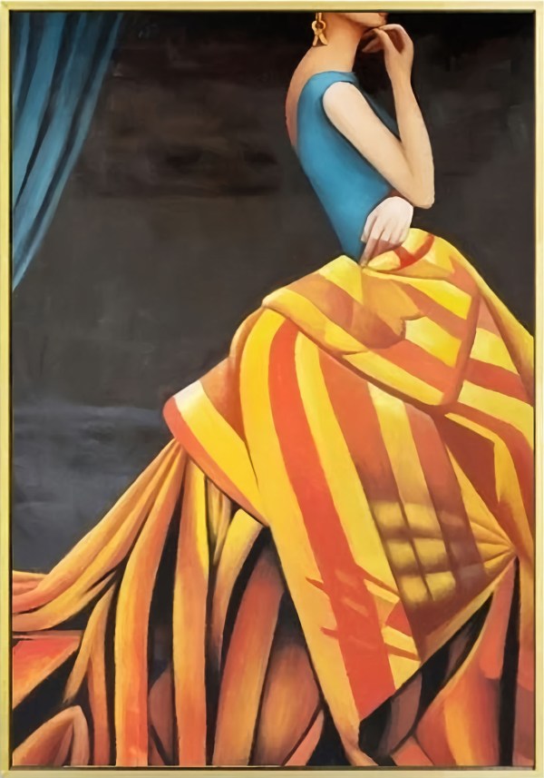 The painting features an woman wearing a vibrant dress with intricate patterns. The dress is characterized by bold stripes in shades of yellow, orange, and red creating an eye-catching visual effect. The top part of the attire is solid blue, complementing the warm tones of the skirt. A dark background contrasts sharply with the bright colors of the clothing. To one side, there’s a glimpse of draped blue fabric adding depth to the composition. The woman’s posture exudes elegance and grace.