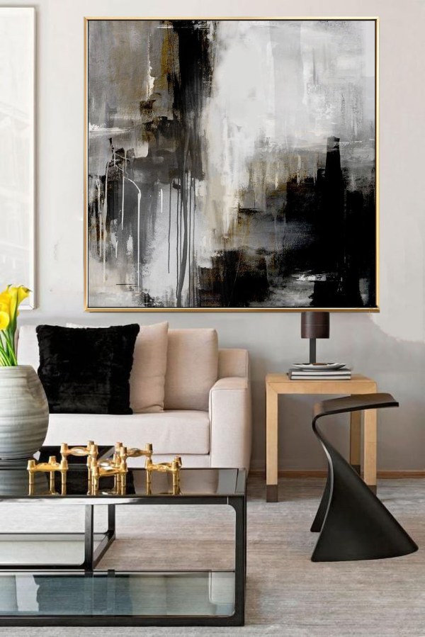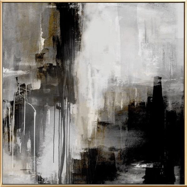 This is a captivating handmade painting that features an abstract design. The painting employs a monochromatic color scheme, utilizing various shades of gray, black, and white to create a visually engaging piece. The painting has a textured appearance, with various brushstrokes and drips adding depth and dimension to the artwork. This textural element brings a sense of dynamism to the piece, inviting viewers to explore the interplay of light and shadow across the canvas.
