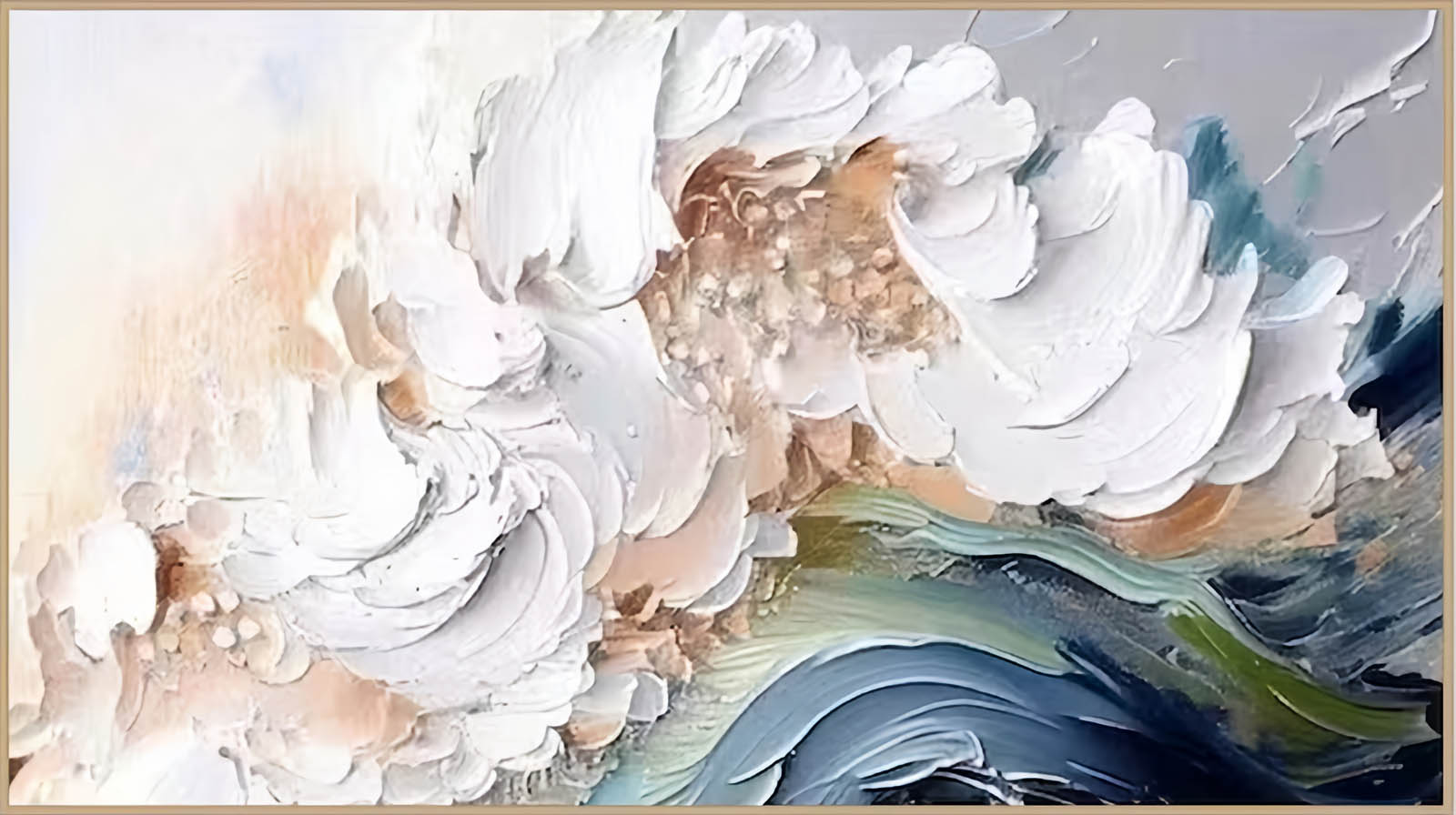 This is a lovely abstract painting that will bring a sense of calm and serenity to your space. The painting is made up of thick brushstrokes in white, beige, and blue colors, creating a wave-like pattern that evokes the ocean and the beach. The painting has a textured appearance with some areas having a raised or 3D effect, giving it a unique and original look. The painting is in a landscape orientation and is framed with a thin black border, making it easy to hang and display. This painting is perfect for anyone who loves the sea or nature, and wants to add some color and freshness to their environment.