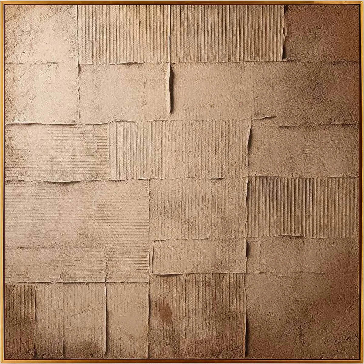 This modern handmade painting features a textured surface composed of rectangular patches arranged in a grid-like pattern. Each patch has a distinct texture, with some displaying horizontal or vertical ridges, while others are smoother. The overall color palette is a warm, earthy beige, giving the painting a natural and organic feel. The edges of the patches are slightly uneven, adding to the handmade aesthetic.