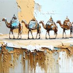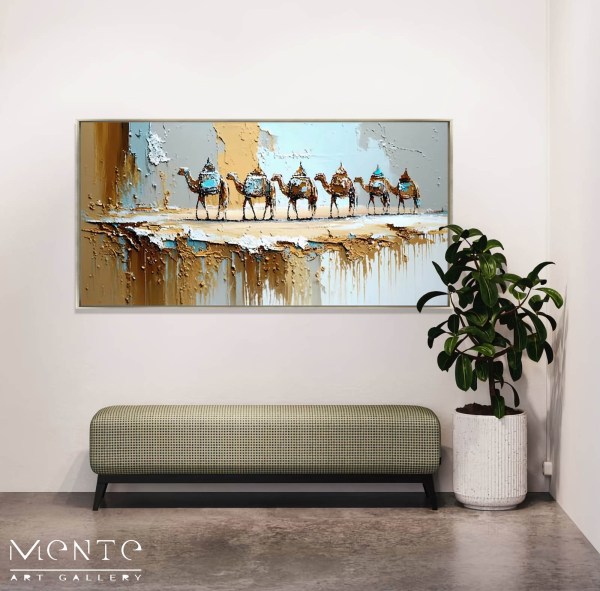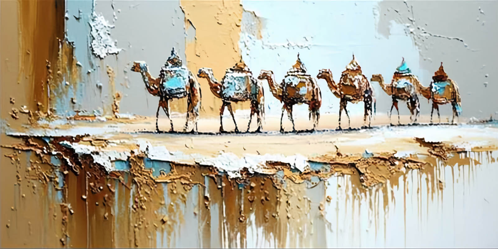 This is a stunning handmade painting of a caravan of camels in the desert. The painting captures the beauty and mystery of the nomadic life, with vibrant colors and expressive brushstrokes. The painting is done in an abstract style, giving it a modern and artistic flair. This painting is perfect for anyone who loves exotic cultures, animals, or landscapes. It would make a great gift or a wonderful addition to your own home.