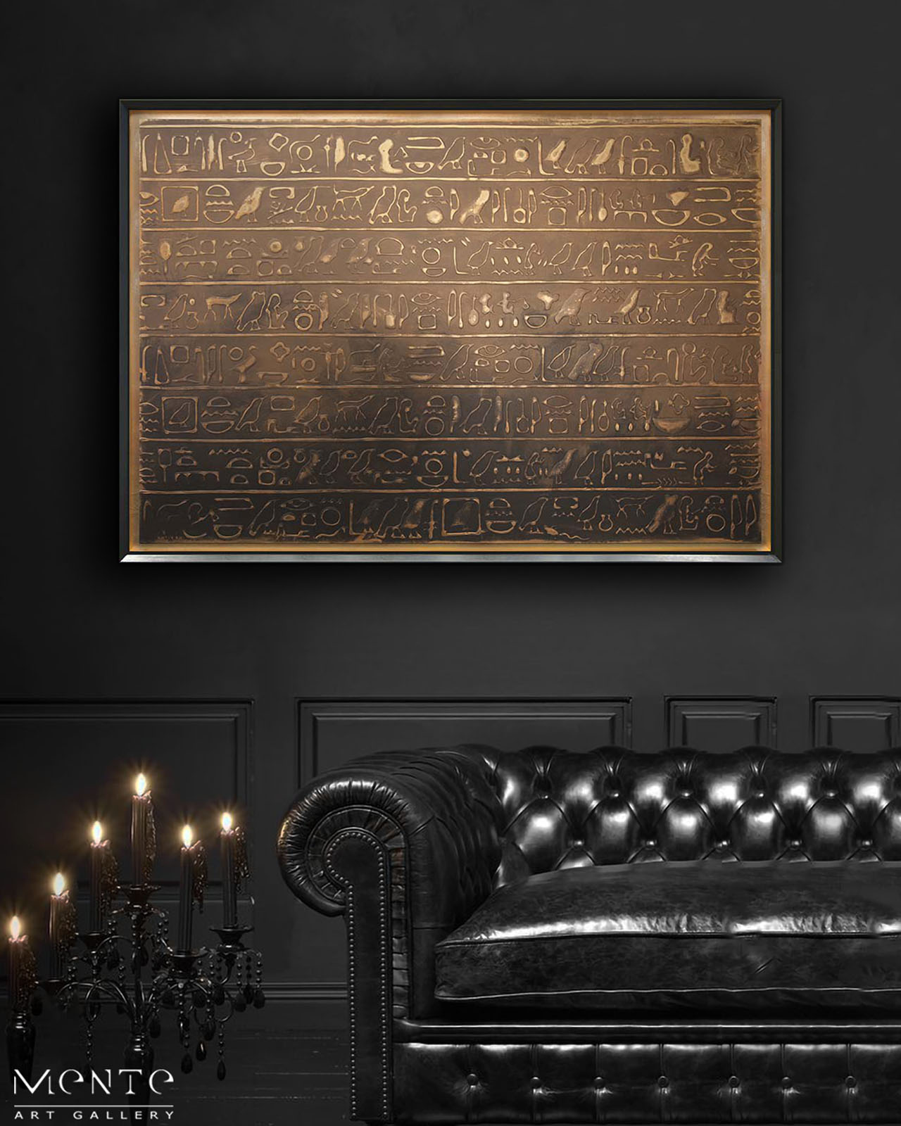 This is a fascinating handmade painting that features a large rectangular panel filled with rows of hieroglyphs. The hieroglyphs, painted in a metallic copper color, are arranged in rows and come in a variety of styles and sizes, adding depth and intrigue to the piece. The background is a solid black color, providing a stark contrast that allows the copper hieroglyphs to stand out. The painting is framed in a simple copper frame with a beveled edge, enhancing its elegance. This painting would make an excellent addition to any collection, especially for those interested in ancient scripts and symbols. Its unique design and striking color contrast make it a captivating piece of art. Please note that due to its handmade nature, each piece may have slight variations, making it unique. Enjoy this exquisite piece of art!