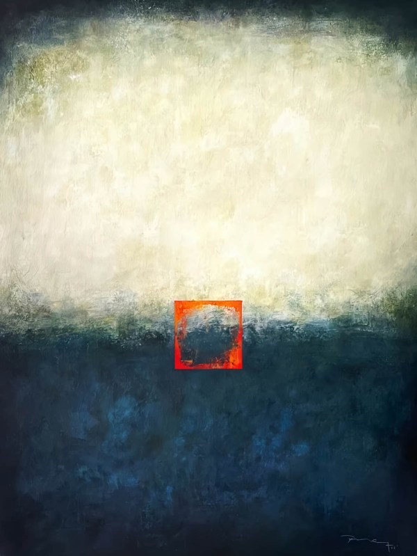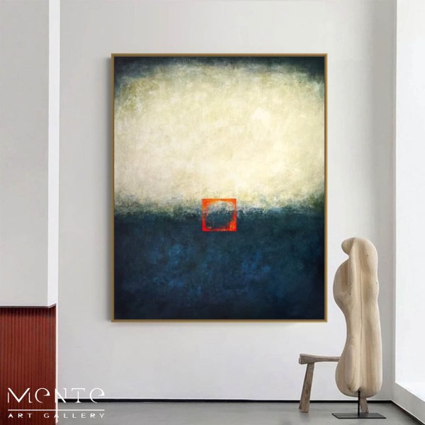 This is a simple and elegant handmade painting that expresses the artist’s minimalist and geometric style. The painting has a blue and white gradient background, creating a soothing and cool effect. The painting has a red square in the center of the image, drawing the viewer’s attention and adding a splash of color. The red square is slightly tilted and has a black outline, giving it a sense of dynamism and contrast. The painting has a textured appearance, enhancing its visual appeal and quality. The painting is an abstract painting with a blue and white gradient background, making it suitable for any room or space. The painting is ideal for anyone who likes minimalist and geometric art and appreciates the artist’s simplicity and creativity. The painting is also a wonderful gift for someone who values art and beauty.