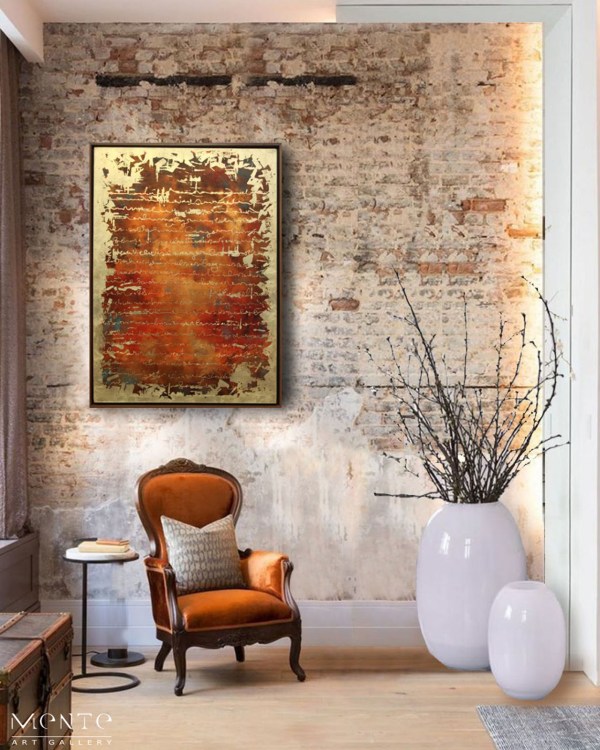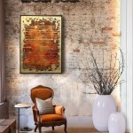 This is a unique handmade painting named “DA VINCI CODE”. The painting features handwritten lines from Leonardo da Vinci’s sketches, creating a layered and intriguing effect. The lines are rendered in predominantly warm tones, with shades of orange, red, and brown, evoking a sense of depth and warmth. The painting is framed in a simple black frame, which complements the artwork without distracting from it. This piece would make a stunning addition to any collection, especially for those who appreciate the fusion of art and historical scripts. Please note that due to its handmade nature, each piece may have slight variations, making it unique. Enjoy this exquisite piece of art!
