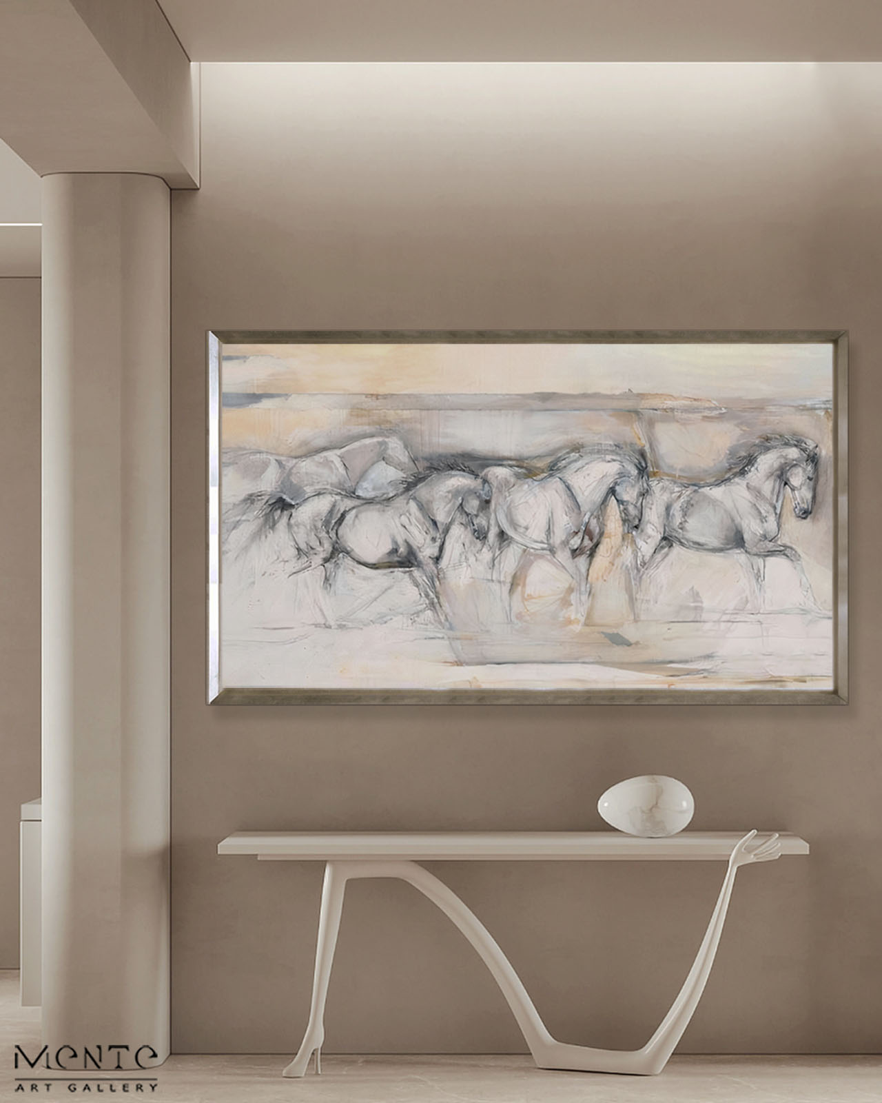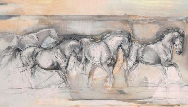 Experience the graceful power of horses captured in a unique abstract style with Descent. This handmade painting showcases a dynamic group of horses in motion, rendered in a loose, sketchy technique. The limited yet elegant color palette of beige, gray, and white blends seamlessly to evoke a serene, cloudy sky background.
