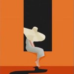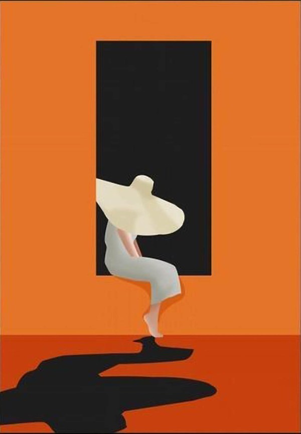 This is an abstract painting that captures a figure in front of a black rectangle on a vibrant orange background. The figure, depicted as a white silhouette, appears to be a person wearing a hat, their body twisted in an unusual, dynamic pose. The figure stands on one leg, with the other bent at the knee and pointing upwards, and their arms are stretched out to the sides. Their head is tilted upwards, as if gazing at the towering black rectangle above them.