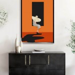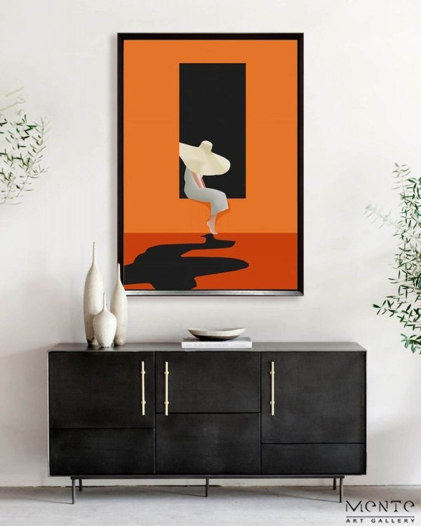 The black rectangle, positioned in the top center of the painting, stands taller than the figure, creating a sense of scale and perspective. The solid orange background provides a stark contrast to both the figure and the rectangle, enhancing their visual impact. The painting exudes a surreal and dreamlike mood, inviting viewers to delve into their imagination and interpret the story behind it. This piece would make a striking addition to any art collection or living space, particularly for those who appreciate abstract art and bold colors.