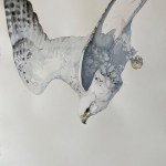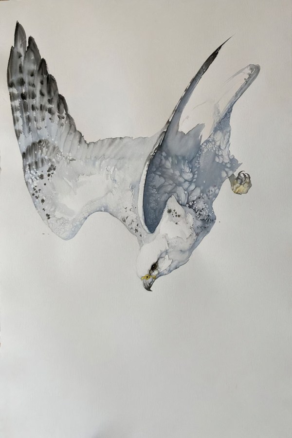 Celebrate the elegance and power of nature with Downfall, a stunning handmade painting that portrays a hawk in mid-flight. This artwork captures the bird’s wings spread wide and angled downwards, showcasing its graceful glide through the air. The minimalist color palette of white, gray, and subtle black detailing brings depth and texture, while the hawk’s striking yellow eyes provide a captivating focal point.
