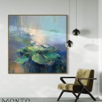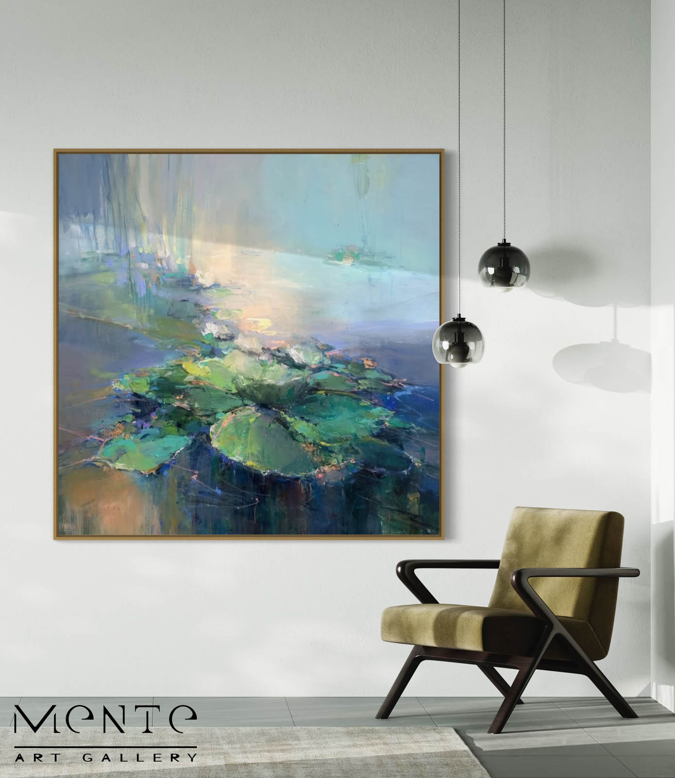 This is a beautiful impressionistic painting that will bring a sense of calm and tranquility to your home. This painting is handmade by a skilled artist who uses oil paints and a palette knife to create a loose, fluid style with broad brushstrokes. The painting depicts a pond with lily pads in a realistic manner. The colors are predominantly blue, green, and white, creating a harmonious and soothing effect. The background is more abstract and consists of vertical lines and drips of paint, adding some contrast and movement to the composition. The overall mood of the painting is peaceful and serene, inviting you to relax and enjoy the view. This painting is a unique and original piece that will enhance any room in your home.