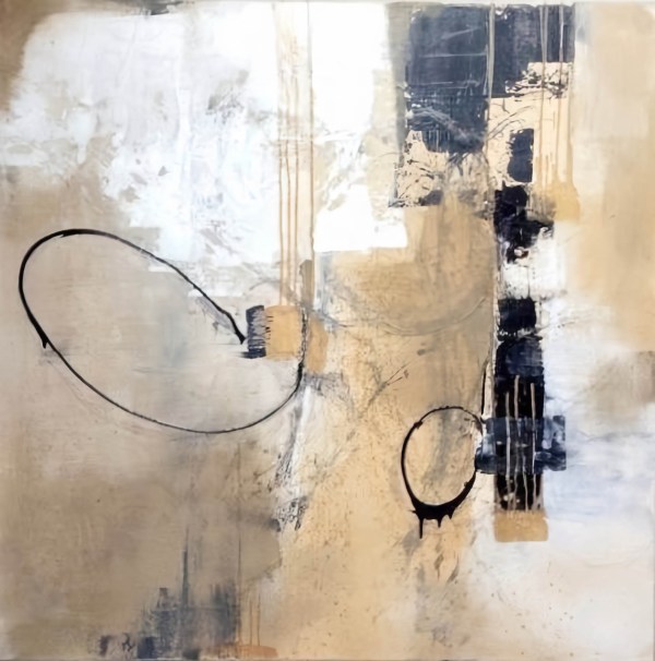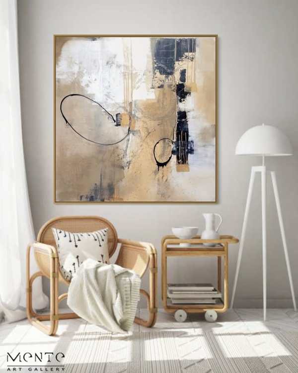 This is an abstract painting that captivates with its simplicity and depth. The painting features a soothing beige background, adorned with black and white elements that create a striking contrast. The artwork is square in shape, adding to its modern appeal. It features two large black circles, one on each side, creating a sense of balance. The left circle is larger and encompasses a smaller circle within it, while the right circle is connected to the left one by a line, creating an intriguing visual path for the eyes to follow. The painting also includes a large white area on the left side and a smaller one on the right, further enhancing the contrast and balance within the piece. A black vertical line on the right side and a black horizontal line on the left side add an additional layer of complexity to the composition.