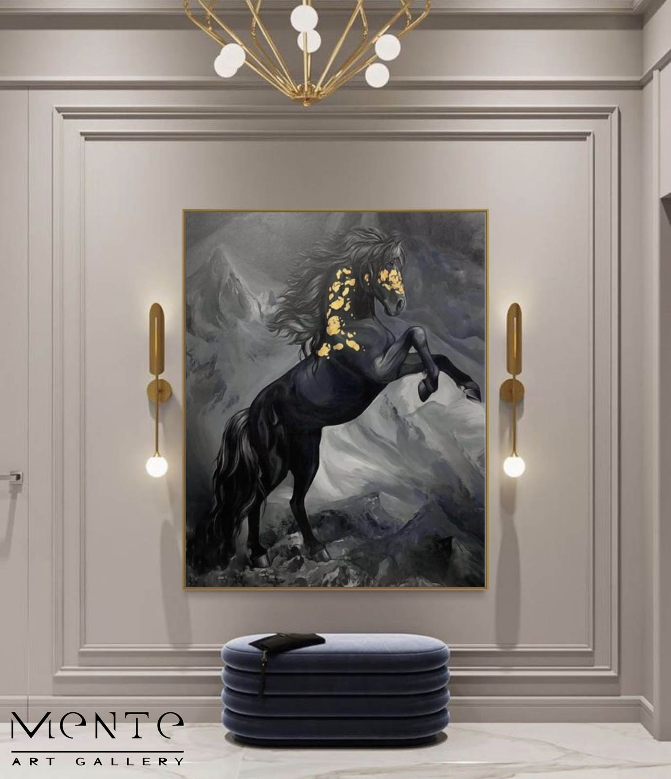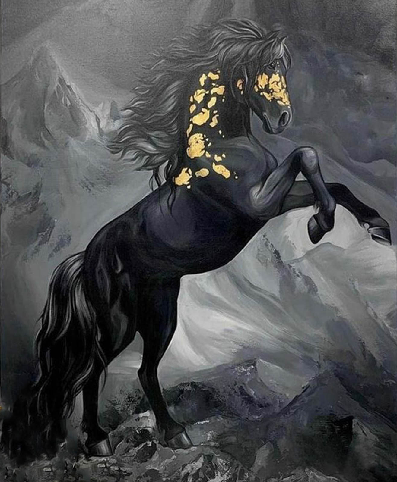 Set against a grayscale mountain landscape under a moody, cloudy sky, this artwork balances drama with beauty. The intricate gold details create a luxurious contrast, making Ebony a captivating centerpiece for any art collection or sophisticated interior.