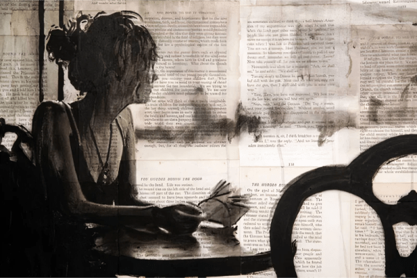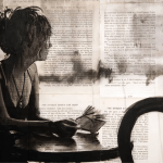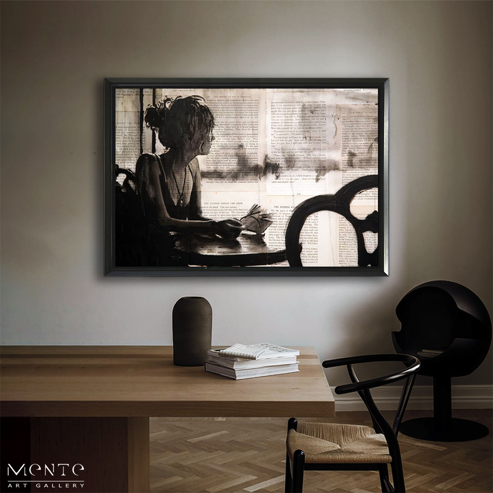 This is a charming handmade painting that depicts a serene scene in black and white. It features a woman sitting at a table, engrossed in a book with a cup of coffee by her side. The woman is elegantly dressed and her hair is neatly tied up in a bun, adding to the vintage feel of the artwork. The background is intriguing, composed of newspaper clippings and a large black circle, which adds depth to the painting. The canvas has a textured feel to it, enhancing the overall aesthetic. This painting, with its calming and vintage vibe, would be a perfect addition to any space. Enjoy this beautiful piece of art!