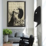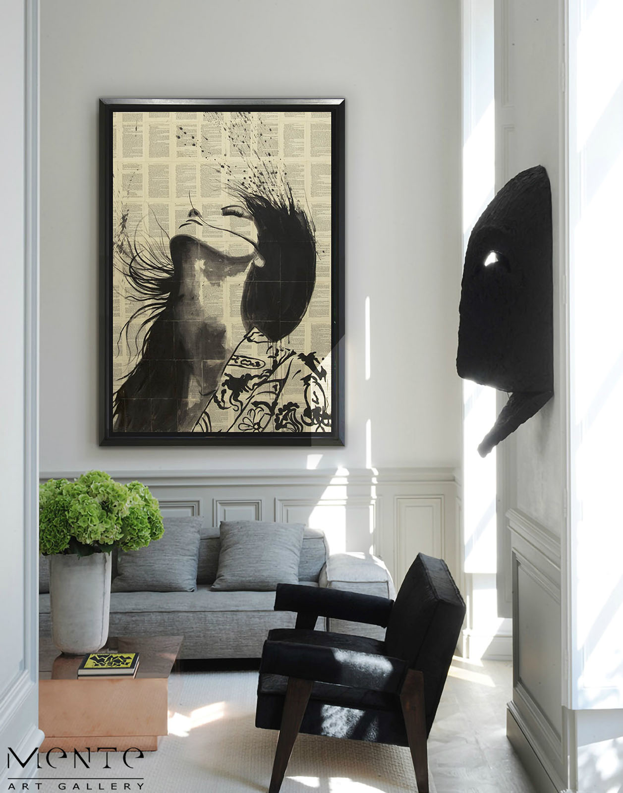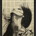 This is a striking handmade painting that showcases a woman’s profile in black and white. Her eyes are peacefully closed, and her hair, blowing in the wind, transforms into a flock of birds, adding a surreal touch to the piece. The background is composed of newspaper clippings, lending an interesting texture and depth to the artwork. The painting is framed in a sleek black frame, enhancing its elegance. This artwork, with its blend of realism and fantasy, would make a unique addition to any art collection or living space. Enjoy this beautiful piece of art!
