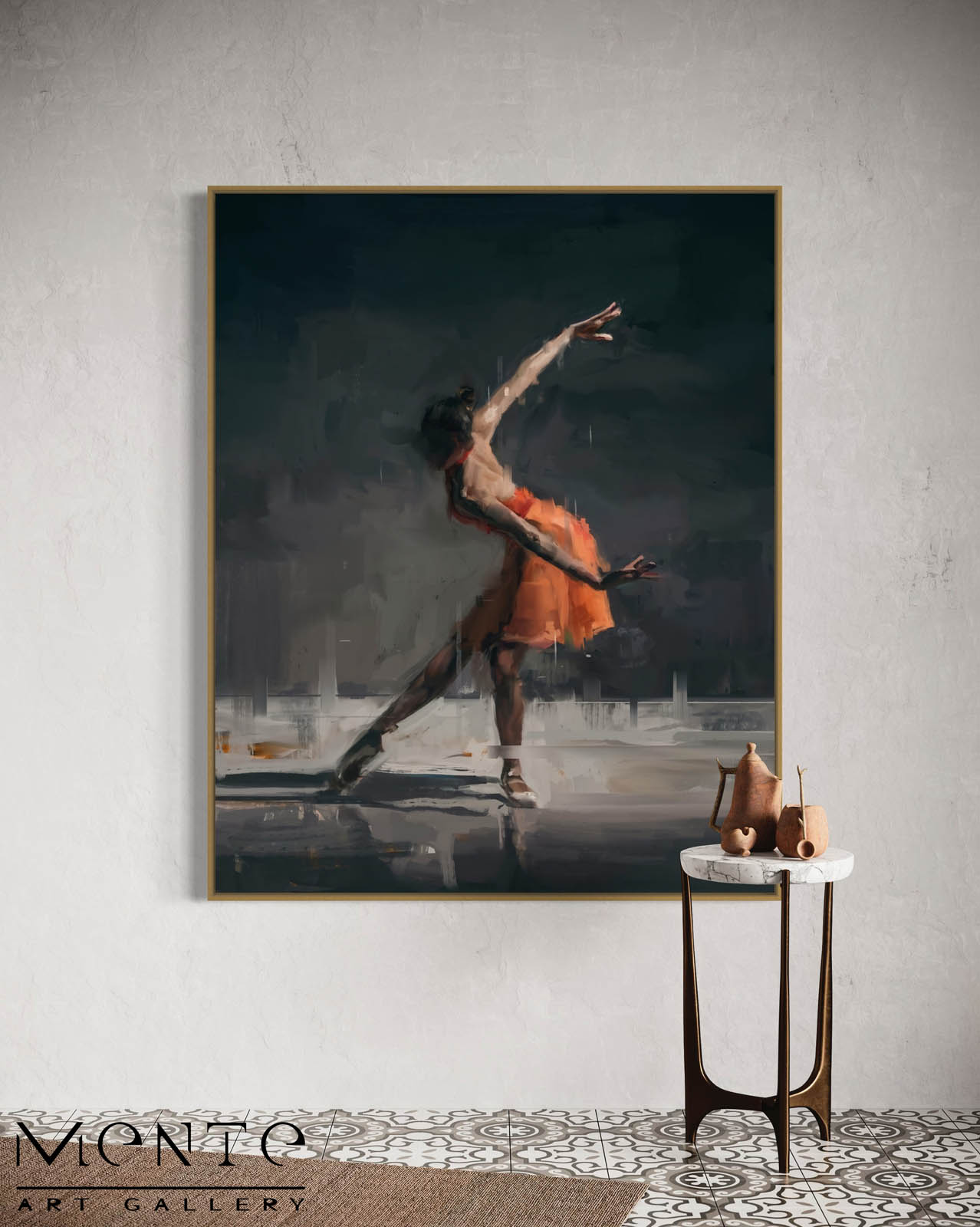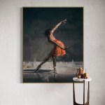 This is a captivating painting of a ballerina dancing on a stage. The painting captures the movement and grace of the dancer, who is wearing an orange tutu and is in a beautiful pose. The painting has a dark background, contrasted by the bright spotlights that illuminate the stage. The painting has an impressionistic style, with visible brushstrokes that create a dynamic and expressive effect. The painting is a unique and original piece of art, that will not be reproduced or copied. The painting is ideal for anyone who loves ballet, or who wants to add some color and elegance to their digital collection.