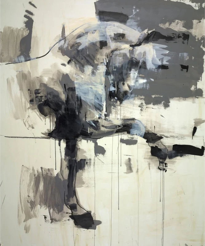 Capture the raw energy and spirit of a horse with Fable, a striking abstract painting rendered in black, white, and gray tones. The horse’s head is lowered and its body twisted, frozen in mid-motion, conveying power and spontaneity through broad, gestural brushstrokes and expressive drips.