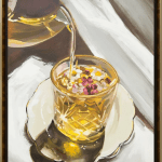 Set atop a white tablecloth with a brown and white striped pattern, the background provides a subtle contrast that enhances the detailed depiction of the tea glass. The piece is framed in a classic gold frame that complements the glass’s golden accents, adding a touch of sophistication.