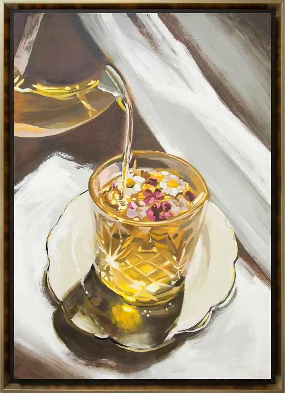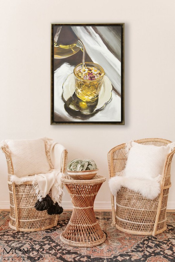 Flower Tea is a charming handmade painting that captures the simple beauty of everyday moments with elegance and warmth. Rendered in a realistic style, the artwork features a traditional glass of tea with delicate purple and yellow flowers floating gently on its surface. The tea glass, with its elegant gold rim and handle, is filled with rich-colored tea, creating a warm and inviting focal point.