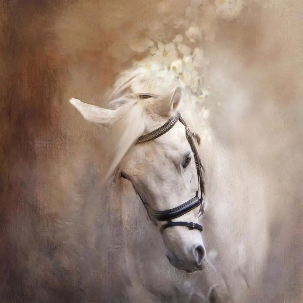 This is a handmade painting that masterfully captures the serene beauty of a white horse. The horse, depicted in profile, wears a black bridle with silver accents, adding a touch of elegance to the image. The artist’s attention to detail is evident in the realistic portrayal of the horse’s flowing mane and peaceful, closed eyes. The background is a soft, blurred brown with white flowers, giving the painting a dreamlike quality. This tranquil setting enhances the peaceful expression of the horse, making it appear as if it’s in a state of bliss.