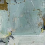 The artwork is an abstract composition predominantly in shades of grey and blue, with subtle accents of gold and white. The textured layers reveal visible brush strokes and palette knife marks, adding depth and dimension. Some areas appear deliberately scraped or dotted, creating intriguing patterns. The use of negative space and the interplay between colors invites varied interpretations. It’s a captivating piece that allows viewers to find their own meaning.