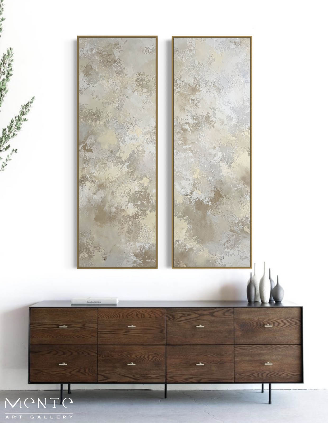 This is a stunning abstract painting that will add a touch of elegance and sophistication to any space. The painting features a harmonious blend of beige, white, and gold colors, creating a warm and inviting atmosphere. The painting has a textured surface, giving it a sense of depth and dimension. The painting has no defined shapes or lines, allowing the viewer to interpret it in their own way. The painting is handmade by a talented artist, using high-quality materials and techniques. The painting is ready to hang, with a wire attached to the back. The painting is a unique and original piece of art, that will not be reproduced or copied. The painting is perfect for anyone who loves abstract art, or who wants to add some flair and personality to their home or office.