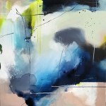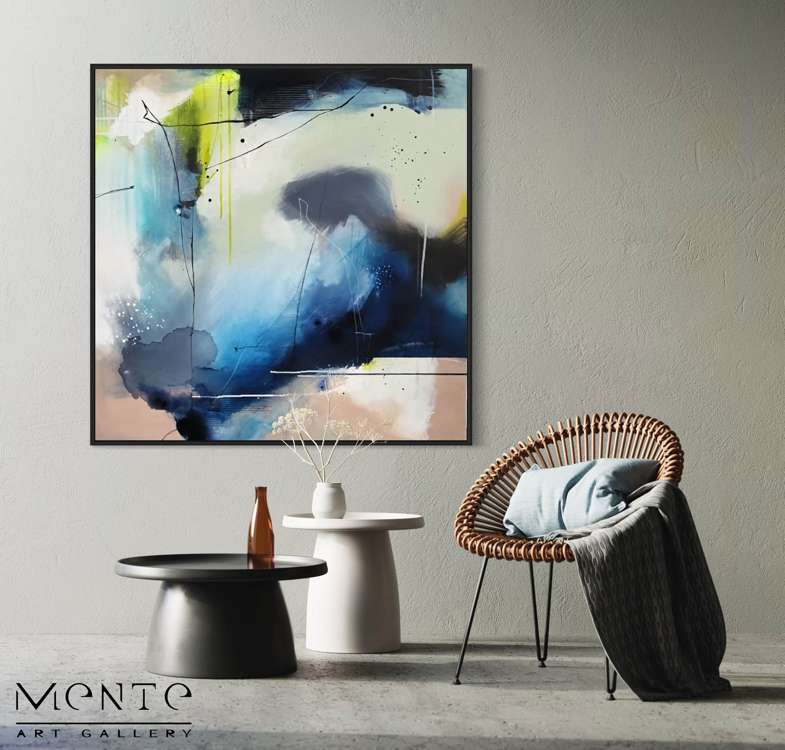 This is an amazing abstract painting that will bring a sense of energy and movement to your home. This painting is handmade by a skilled artist who uses acrylic paints and a variety of tools to create a mix of colors and textures. The painting is predominantly blue and black with splashes of green and yellow. The painting has a mix of lines, curves, and splashes that create a dynamic and lively effect. The painting has a white background with the colors layered on top, creating a contrast and depth. The painting has a square format and is displayed on a white wall, showing its simplicity and elegance. This painting is a one-of-a-kind piece that will make a statement in any room.