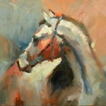 Set against a lively background of soft blue, orange, and white tones, the horse’s head takes center stage, making it the focal point of the composition. The artist’s expressive use of color and texture gives the painting a warm, emotional presence that resonates with viewers.