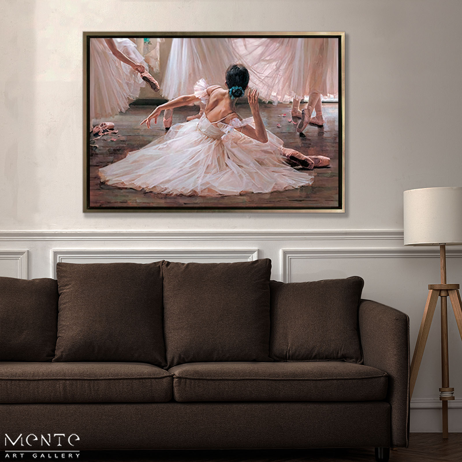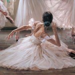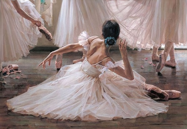 This oil painting captures the grace and elegance of a ballerina. The ballerina, dressed in a white tutu, is sitting on a wooden floor with her back to the viewer, adding a touch of mystery to the piece. A blue flower adorns her hair, and she holds a pair of pointe shoes in her hand, symbols of her dedication and passion for dance. In the background, the feet and legs of other dancers are visible, suggesting a bustling ballet studio. The wooden floor and white curtains in the background create a serene and peaceful atmosphere. The mood of the painting is melancholic, evoking a sense of longing and nostalgia. The color palette is predominantly white and pastel, adding to the overall tranquility of the scene. This painting is not just a piece of art; it’s a window into the world of ballet. It would make a beautiful addition to any home or office, especially for those who appreciate the beauty and discipline of dance.
