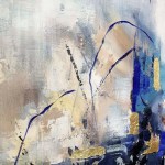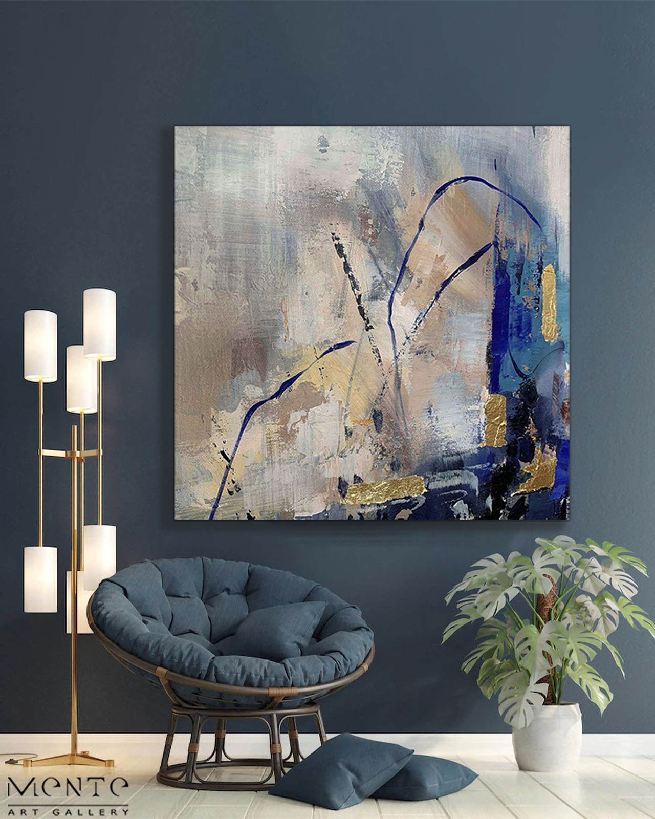 This abstract painting is a visual feast of color and texture. It features a harmonious blend of different shades of blue, gold, and white, creating a soothing and calming effect. The textured background of the painting, with visible brushstrokes, adds depth and character to the piece. It creates an interesting contrast with the few curved lines in blue that stand out against the background, adding a dynamic element to the composition. The painting also features a few gold accents that add a pop of color to the overall composition. These gold accents catch the light beautifully, adding a touch of elegance and sophistication to the piece.