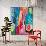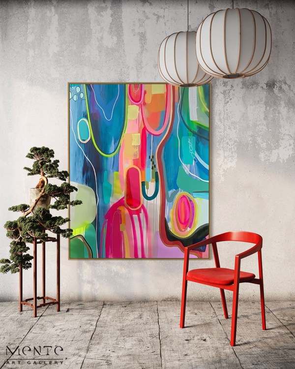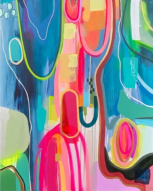The painting is an abstract artwork with various bold colors including blues, pinks, greens, yellows. Different shapes like circles, squares and irregular forms are visible. There are also distinct lines in various thicknesses crisscrossing the painting. The use of color gradients gives depth to the shapes. Some areas have patterns or textures adding complexity to the visual experience. It exudes an energetic yet harmonious vibe due to its color combination.