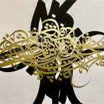 At the center lies a strong black form, from which finely crafted gold calligraphy and shapes radiate, offering both cultural depth and visual complexity. The textured surface adds a tactile quality, making the artwork as engaging to the touch as it is to the eye.