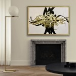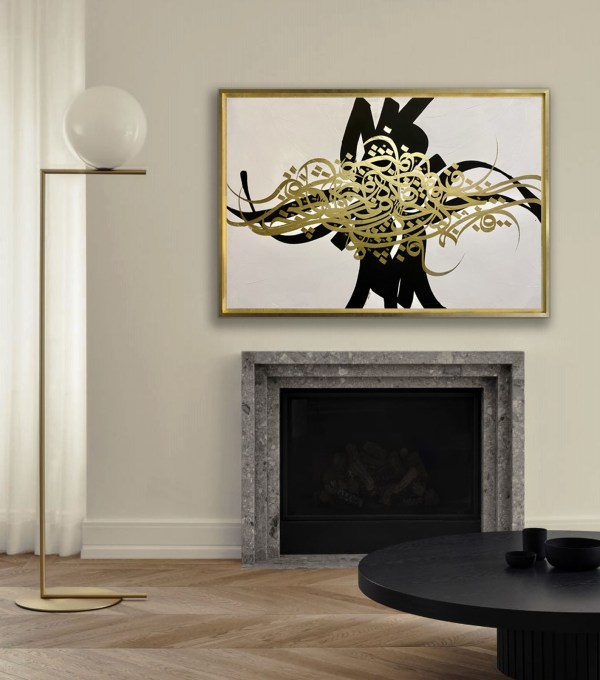 “Gold Vision” is a powerful modern abstract painting that seamlessly blends Arabic calligraphy with bold visual elements. Dominated by black and gold tones on a white background, this piece captures attention with its dramatic contrast and intricate detail.