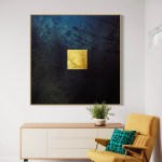 This is an interesting abstract image of a gold square on a black background that will create a striking and modern look in your space. The image has a grungy and distressed feel to it, as the background is black with blue and green speckles, giving it a sense of depth and texture. The gold square is in the center of the image and is slightly textured, creating a contrast and a focal point. The image has a simple and minimalist design, but also a rich and complex appearance. This image is perfect for anyone who loves abstract art and wants to add some style and sophistication to their space.