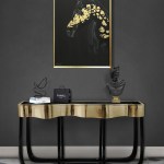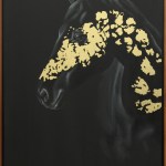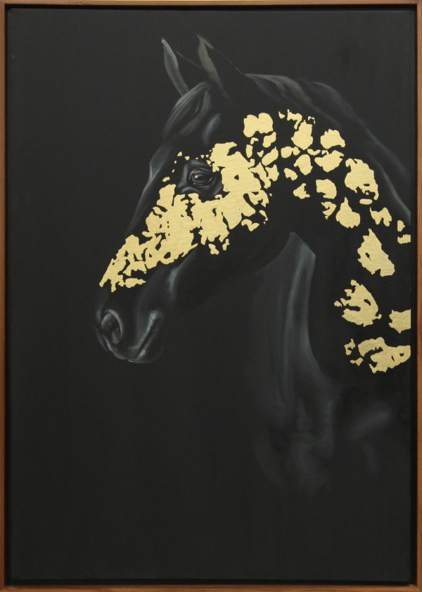 The horse’s visible eye adds emotional depth and realism, while the dramatic black background intensifies the visual impact and makes the golden highlights truly shine. Framed in a simple wooden frame, this artwork strikes a perfect balance between sophistication and raw beauty.